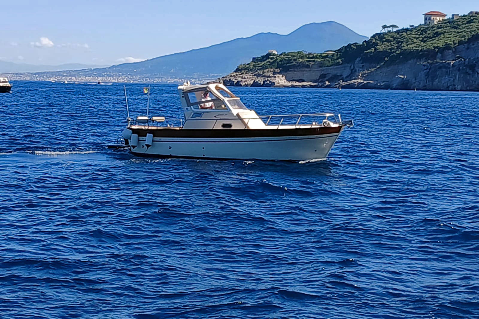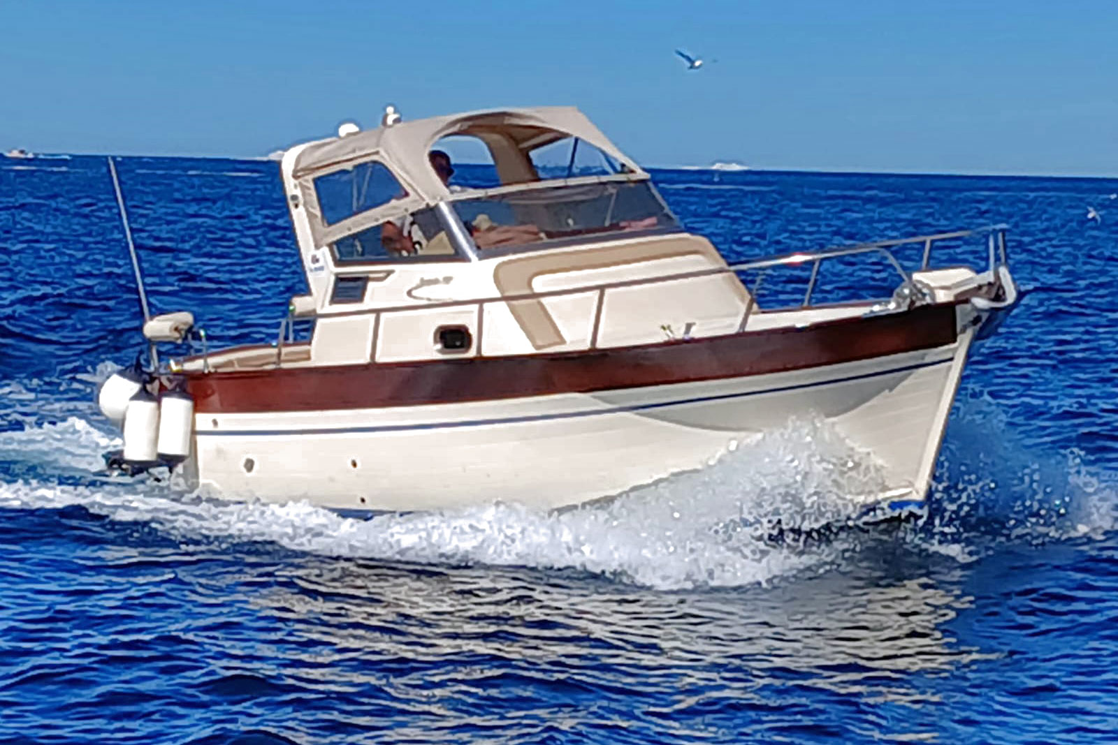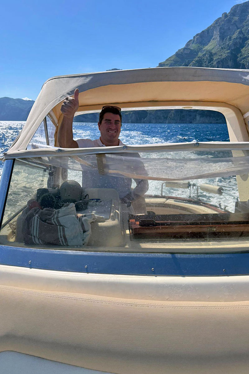 A bordo del nostro Gozzo Tecnonaautica Jeranto 7.50 potrai vivere un’esperienza autentica e confortevole tra le acque della Penisola Sorrentina e della Costiera Amalfitana. La barca è dotata di cabina con bagno separato, ampio prendisole a prua per rilassarsi al sole e una comoda seduta a poppa con tendalino ombreggiante, ideale per godersi la navigazione anche nelle ore più calde.